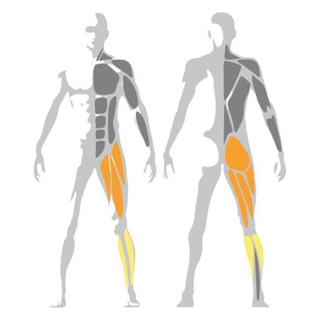 Muscles trained: Quadriceps, Gluteus, Hamstrings, Gastrocnemius, Soleus