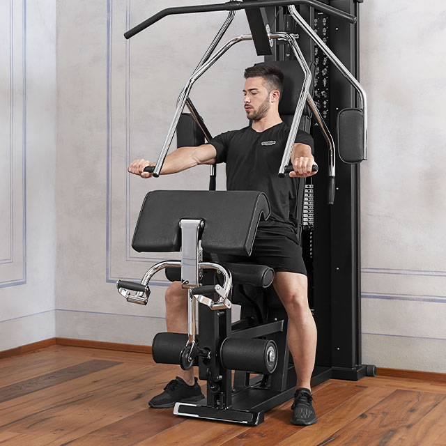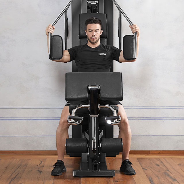 The Unica compact complete home gym brings an all-in-one exercise machine right into your home. Forget having to find space for several pieces of equipment or constantly moving from one to the other, you can do every exercise in your routine on this compact workout machine. Performing every exercise from one seat makes it very versatile while at just 72 x 47 x 81 inches and 640 lbs. in weight, it is ideal for most rooms of the home. Unica compact home exercise machines even complement your decor, coming in an elegant choice of frame and upholstery colors. Push your compact home gym machine against the wall in a living room or bedroom or make it the centerpiece of a home gym in the loft, basement, or garage. Wherever you place your compact multi station home gym, just ensure the flooring beneath is durable and non-slip.